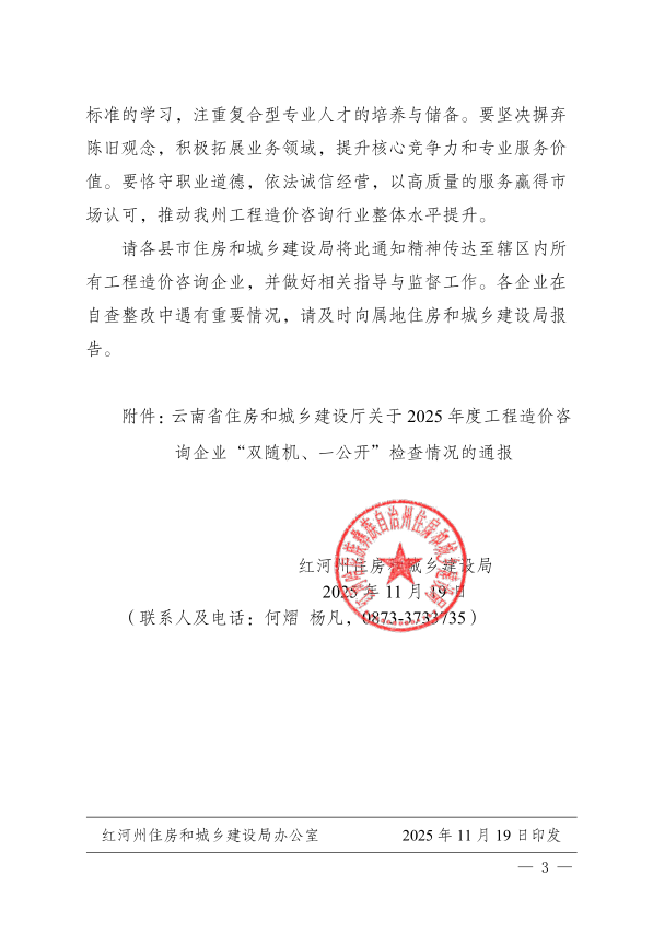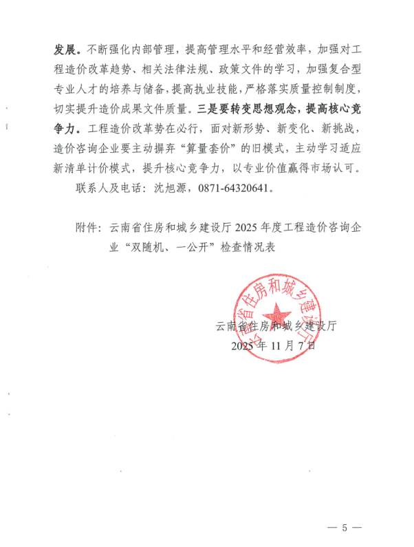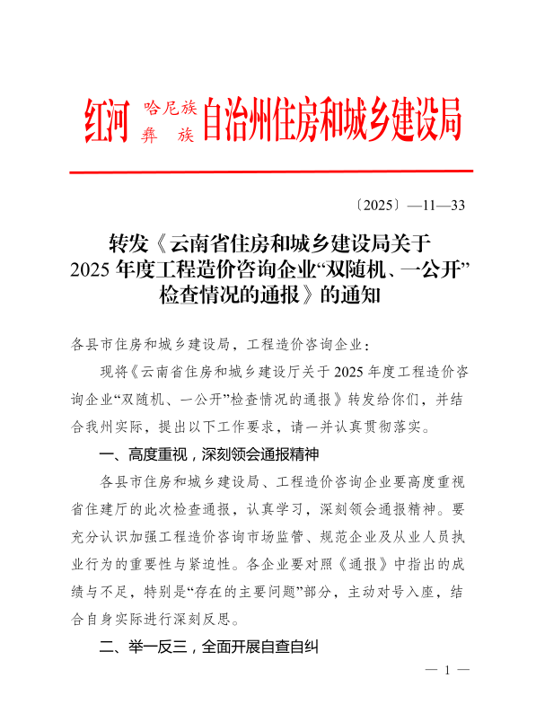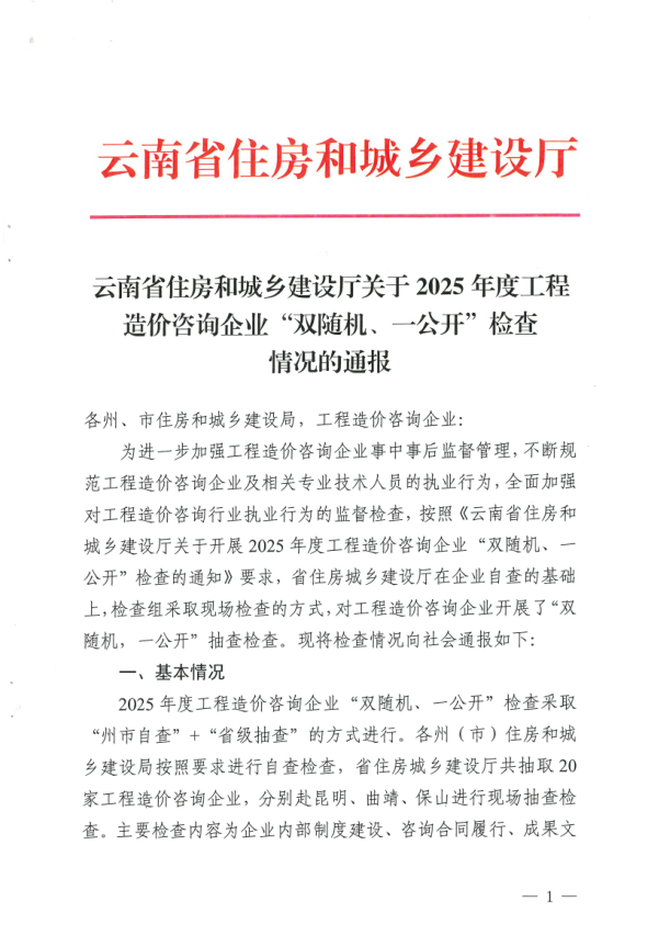 转发《云南省住房和城乡建设局关于2025 年度工程造价咨询企业“双随机、一公开”检查情况的通报》的通知